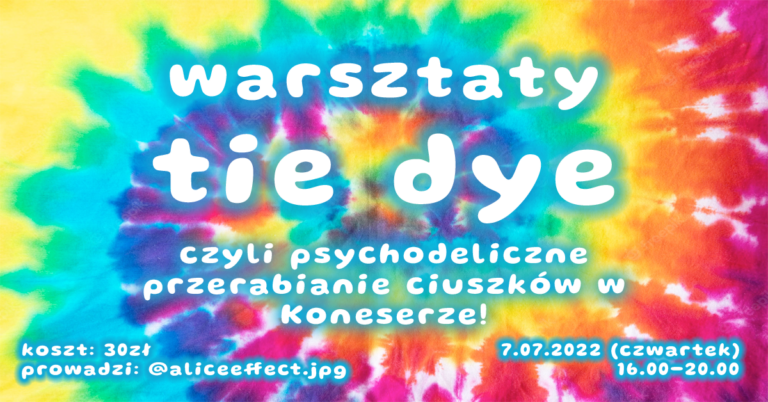 więcejPierwsze w tym sezonie wydarzenie z serii kreatywnych warsztatów na Placu Konesera. ☆ Już w czwartek dowiecie się jak zabarwiać tkaniny w psychodeliczne wzorki i przetestujecie swoją kreatywność. Koszt barwników jest wliczony w cenę warsztatów, można przynieść własne ciuszki lub skorzystać z tkanin dostępnych na miejscu. Start: 16:00 ☆ Zajęcia poprowadzi: Alicja Krzyżanowska (instagram: aliceeffect.jpg) […]